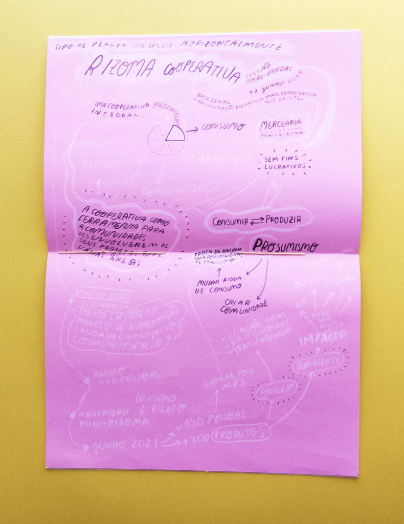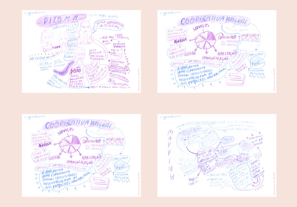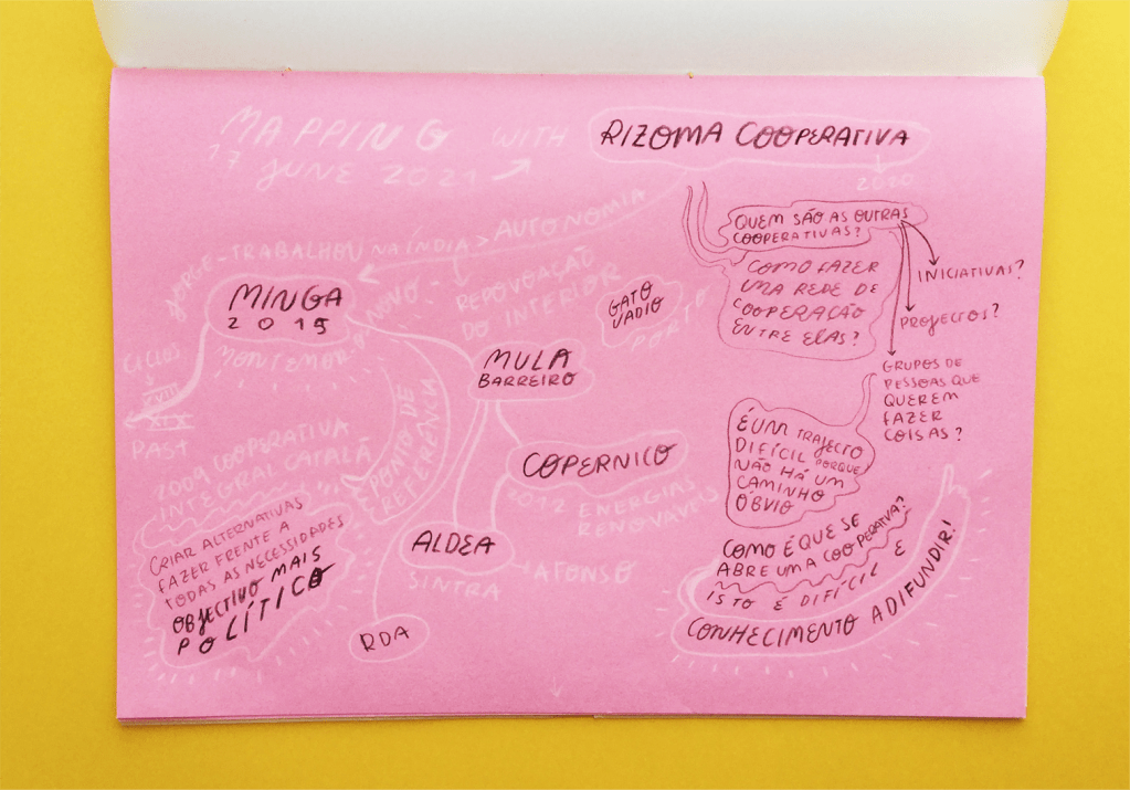 The Rizoma Cooperativa was the first initiative that I engaged with because, as luck would have it they were running an introductory session on week 03 of LoCDI. I attended the session and afterwards had a conversation with one of the organising members. The sketches I produced during the introductory session were useful to introduce my work and acted as an example of what I mean by sketching cooperatives. In this exchange we created a map of the other cooperatives part of their ecosystem, together with thoughts and needs for how they would like to connect with them.