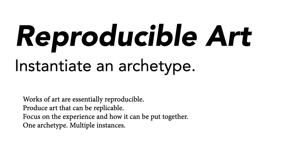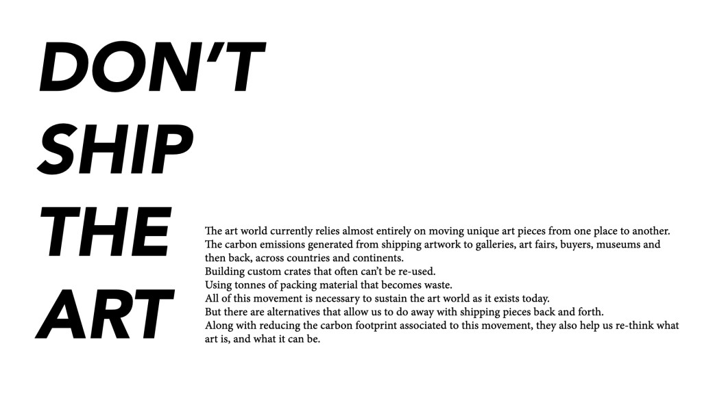 The art world currently relies almost entirely on moving unique art pieces producing massive amounts of greenhouse emissions. This project questions this practice and invites us to rethink the reproducibility of art, archetypes, and instances in which art is created, shared, sold, and collected. Can virtual art be a legitimate format like any other?