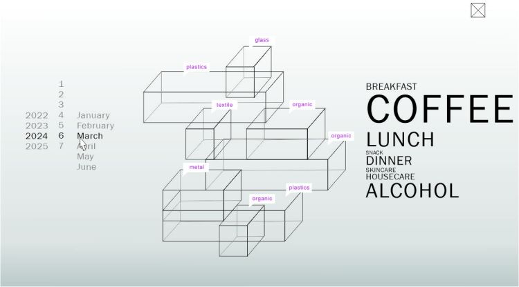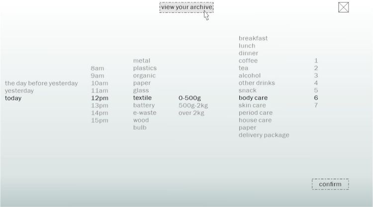 It is designed in a way that it can scale from single-person waste data collection to the emergence of positive group dynamics of collecting waste data in a community. The project explores interfaces to a virtual environment supporting multiple users and we encourage and facilitate long-term engagement with the archive. These interfaces include the real-time personal waste data visualization and future waste prediction to support micro-actions and reactions towards environmental concerns; and extend the ways in which users’ waste data are represented for each other.